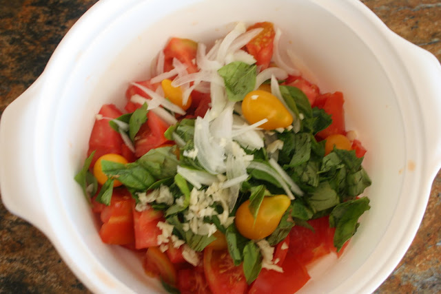 2. Add whole Yellow Pear tomatoes, torn basil, sliced onion, minced garlic to diced tomatoes. Toss. Drain any excess liquid.