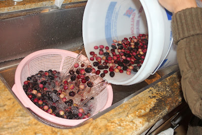 Here they are in the kitchen, getting hosed off again. Pick through and discard any olives that look under-ripe (i.e., not black) or blemished.