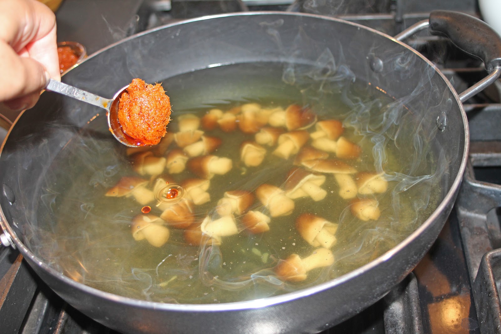 Add straw mushrooms and 1 tbsp. of Tom Yum paste.