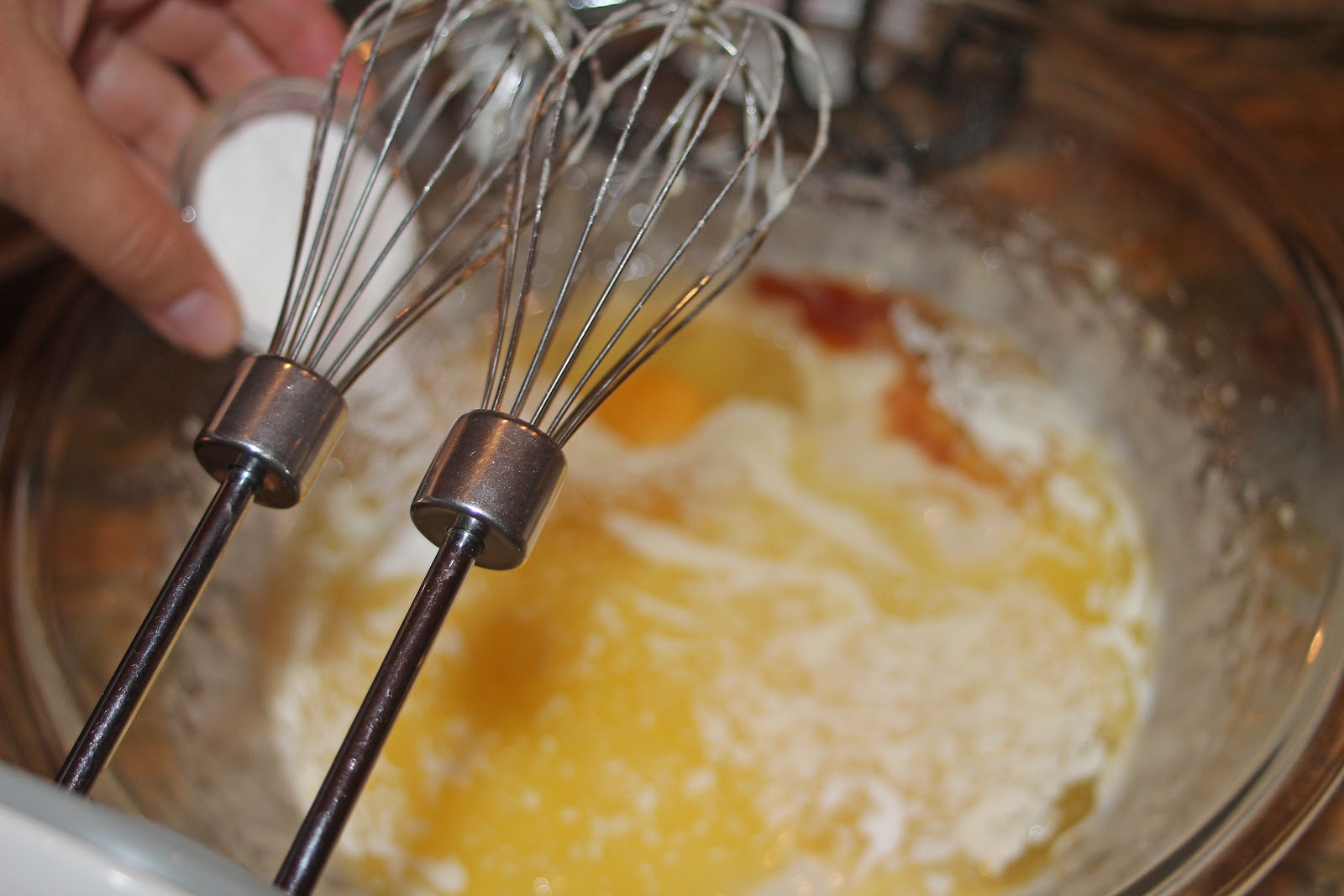 Add melted butter, eggs & vanilla.