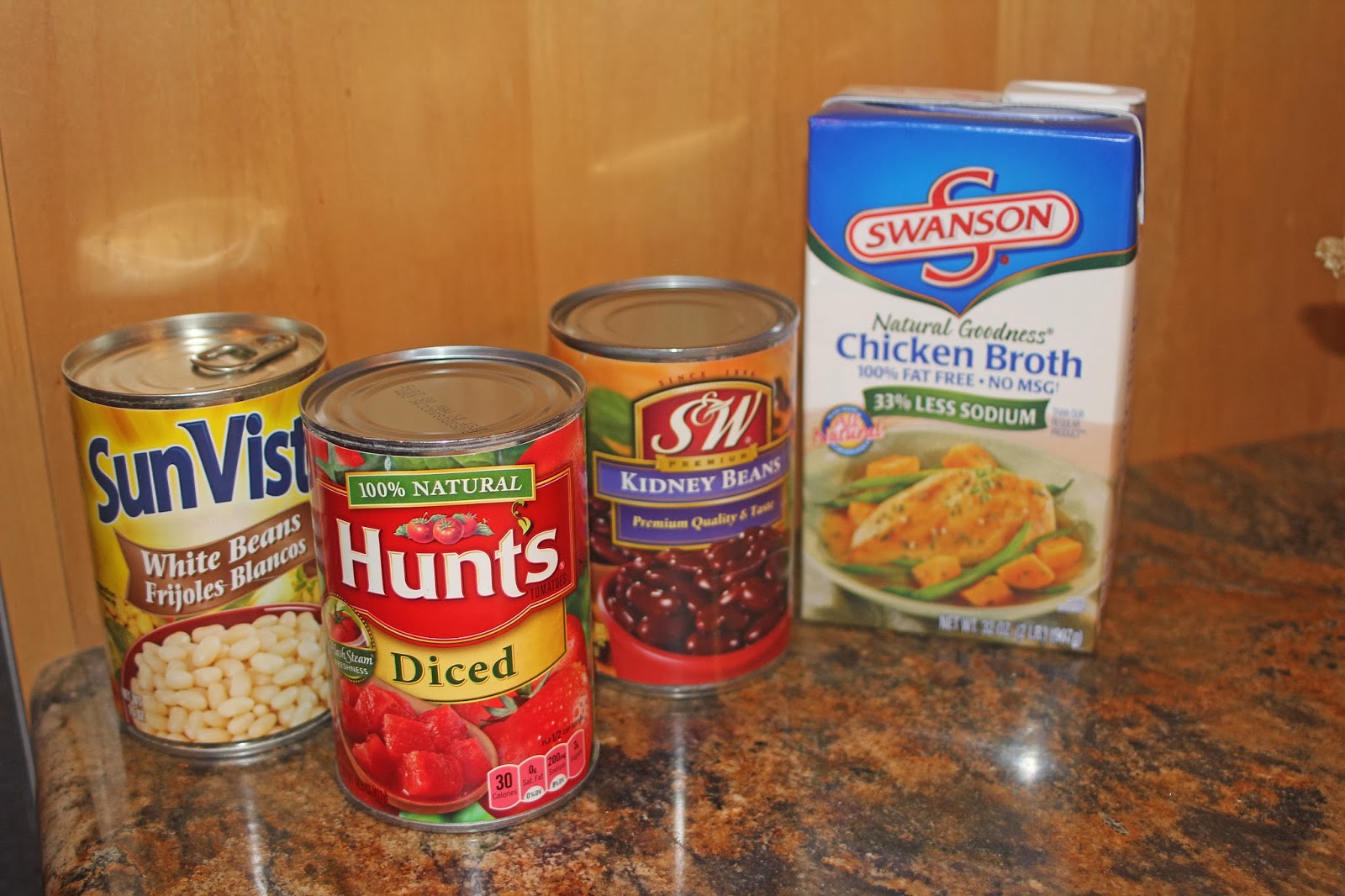 Great Northern white beans, kidney beans, diced tomatoes and low sodium chicken broth.