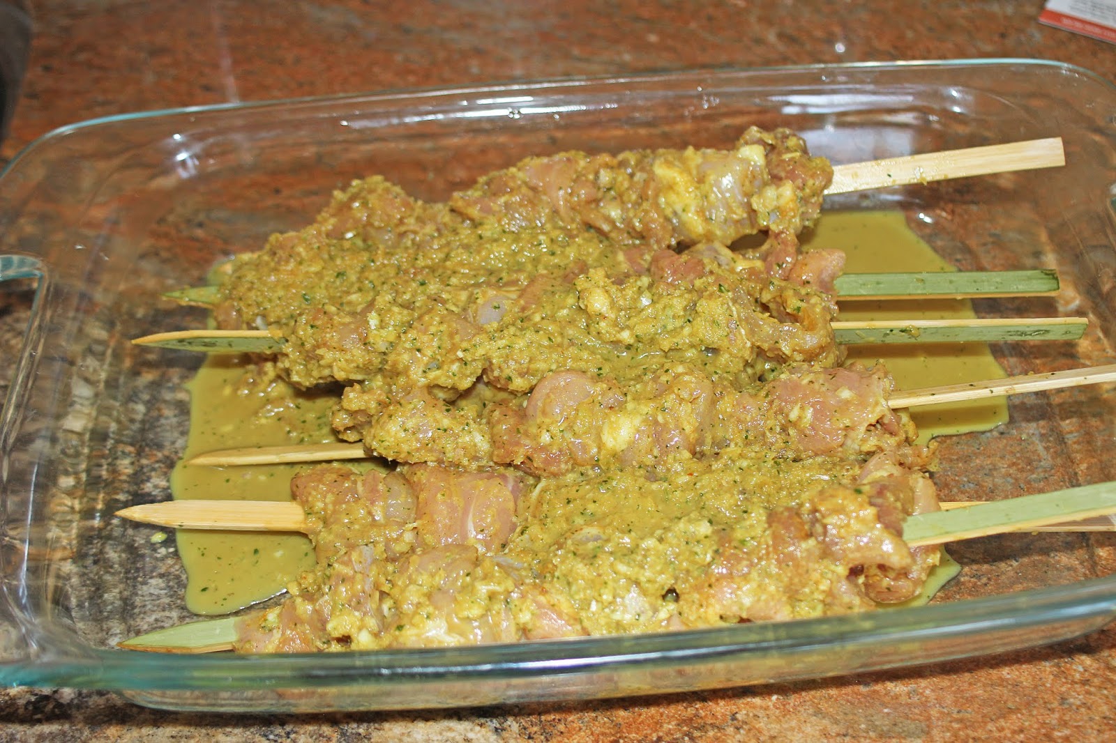 6. Skewer 4-5 pieces of the marinated chicken onto each skewer. Grill the chicken about 10-12 minutes, turning over once, until just cooked through.